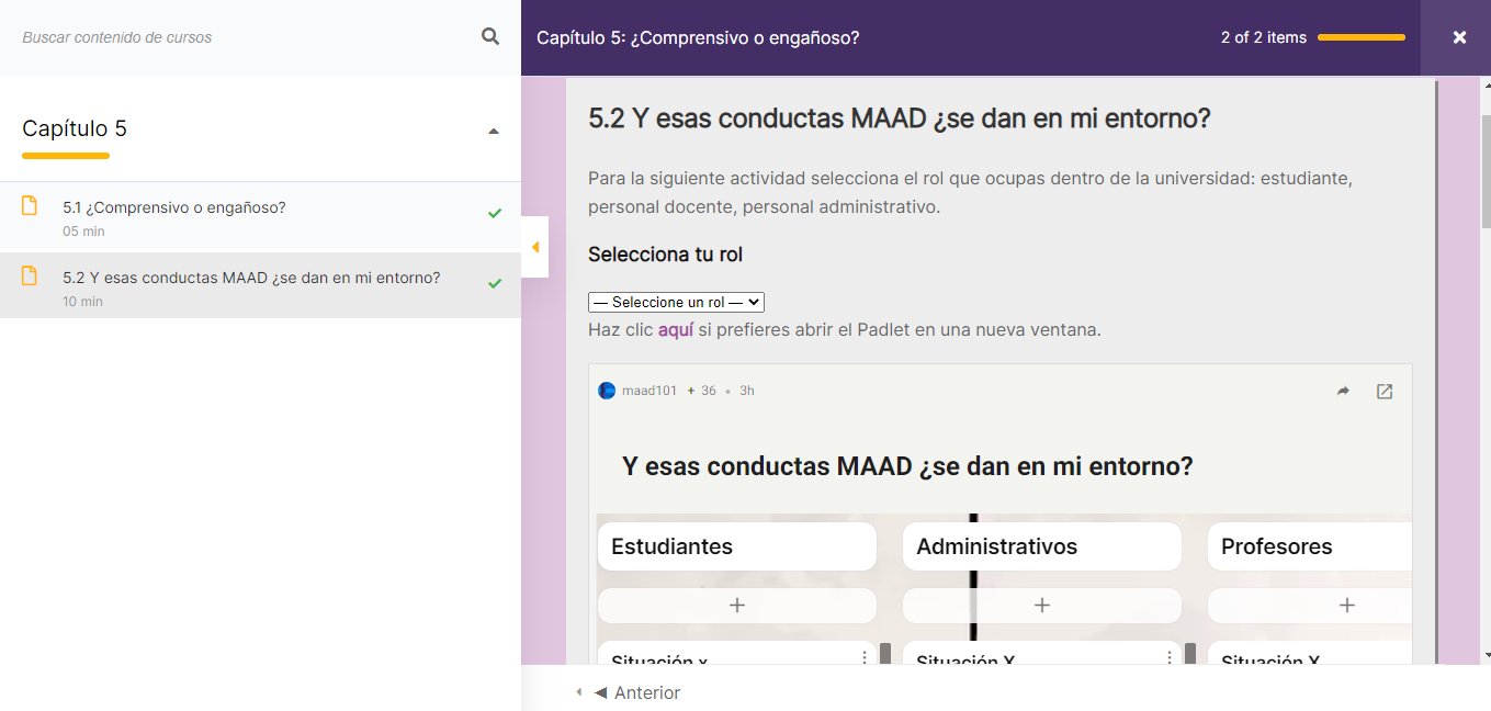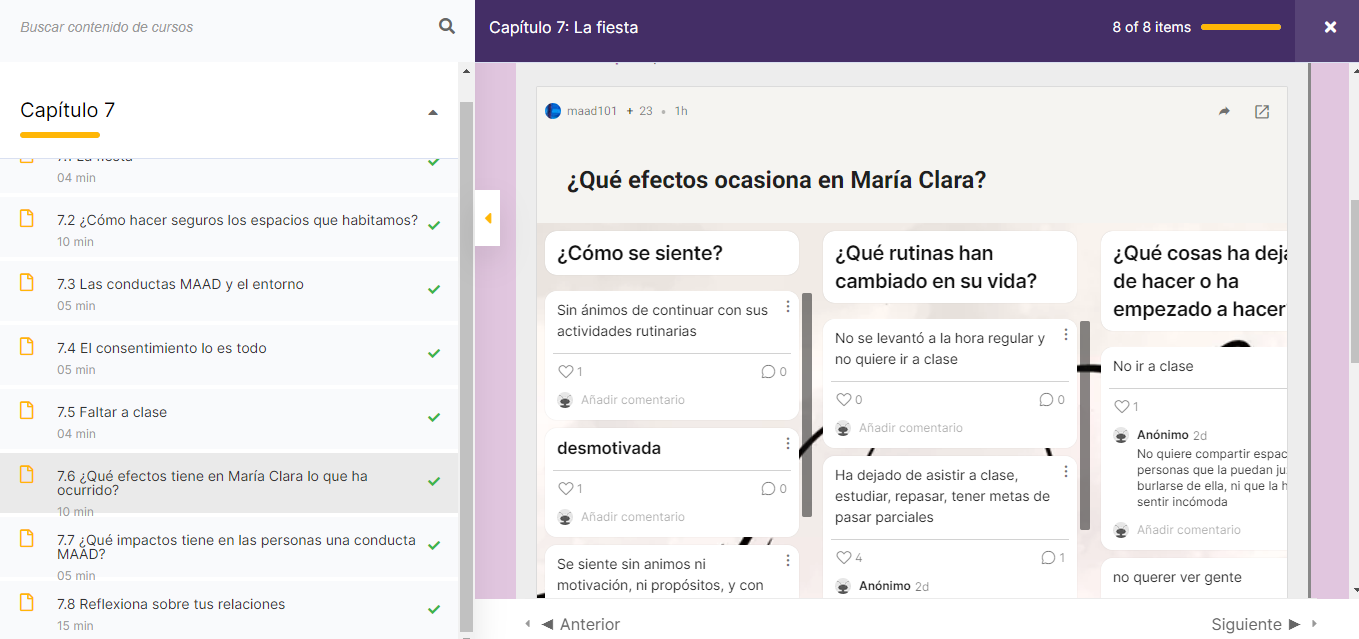 Funciona con una metodología 100% virtual y asincrónica. Se compone de 10 capítulos. Cada capítulo comprende una variedad de actividades, en total 59, que consisten en: videos con narrativa de caso, actividades didácticas de reflexión individual o grupal, actividades propositivas frente a la prevención de conductas MAAD, actividades encaminadas a la revisión de recursos teórico-prácticos, otras orientadas a la comprensión y sensibilización de las conductas MAAD y al reconocimiento de rutas y vías institucionales para su atención y manejo. La narrativa del curso es sugestiva, reflexiva y crítica. Tiene un hilo conductor que se adecúa con las actividades.