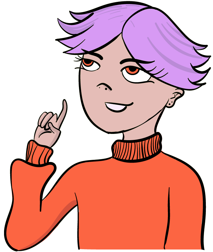 Ilustración digital de una persona con cabello morado y saco naranja que mira y señala el título de la página.